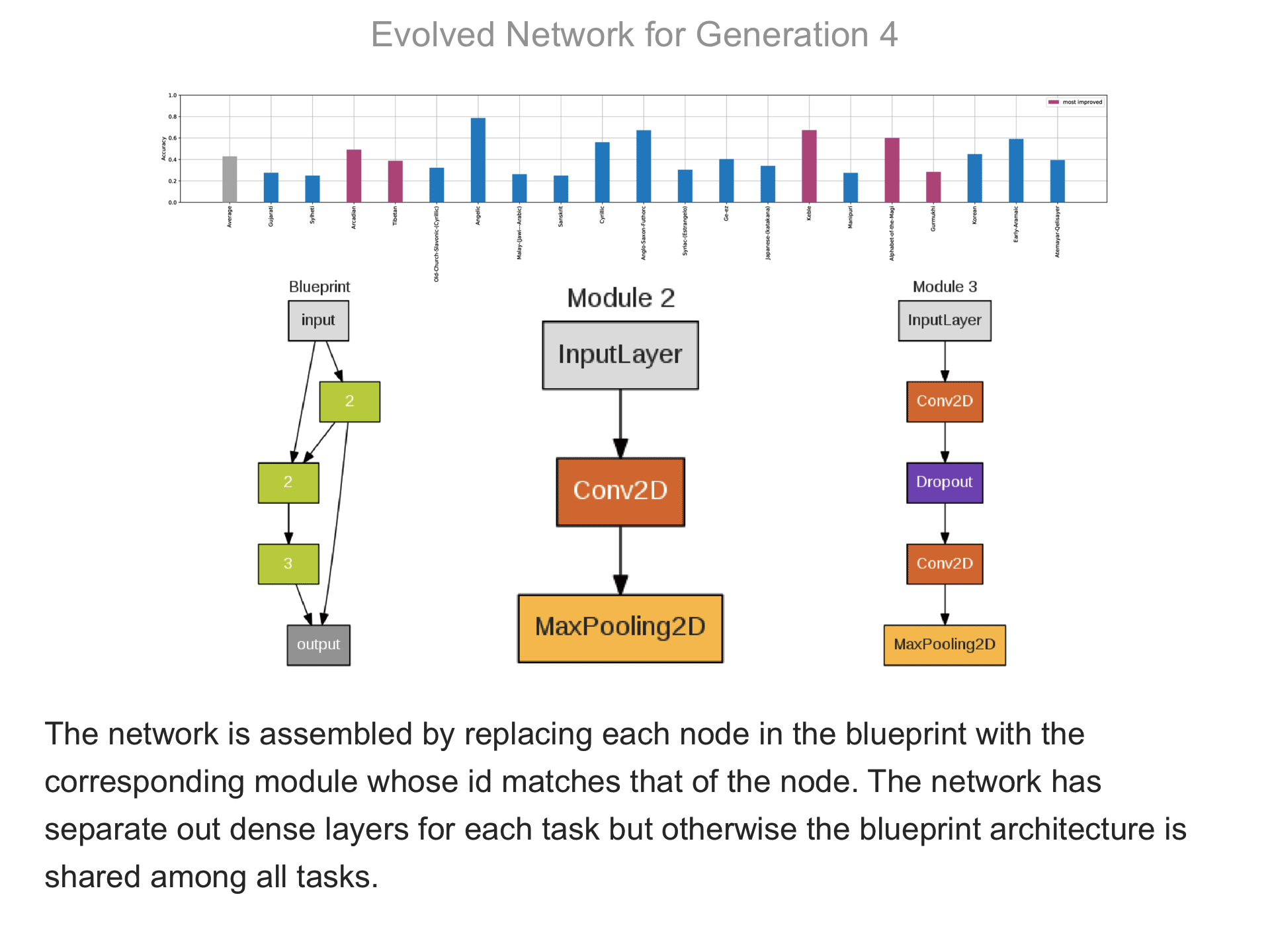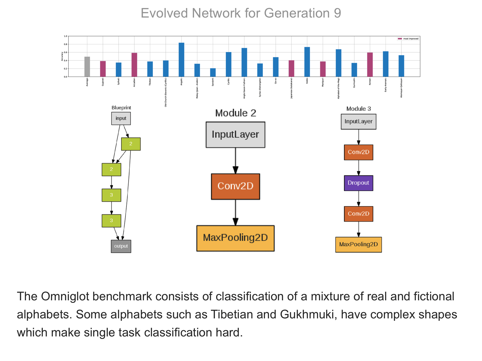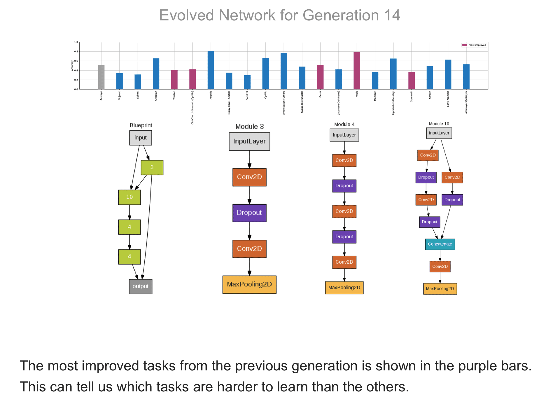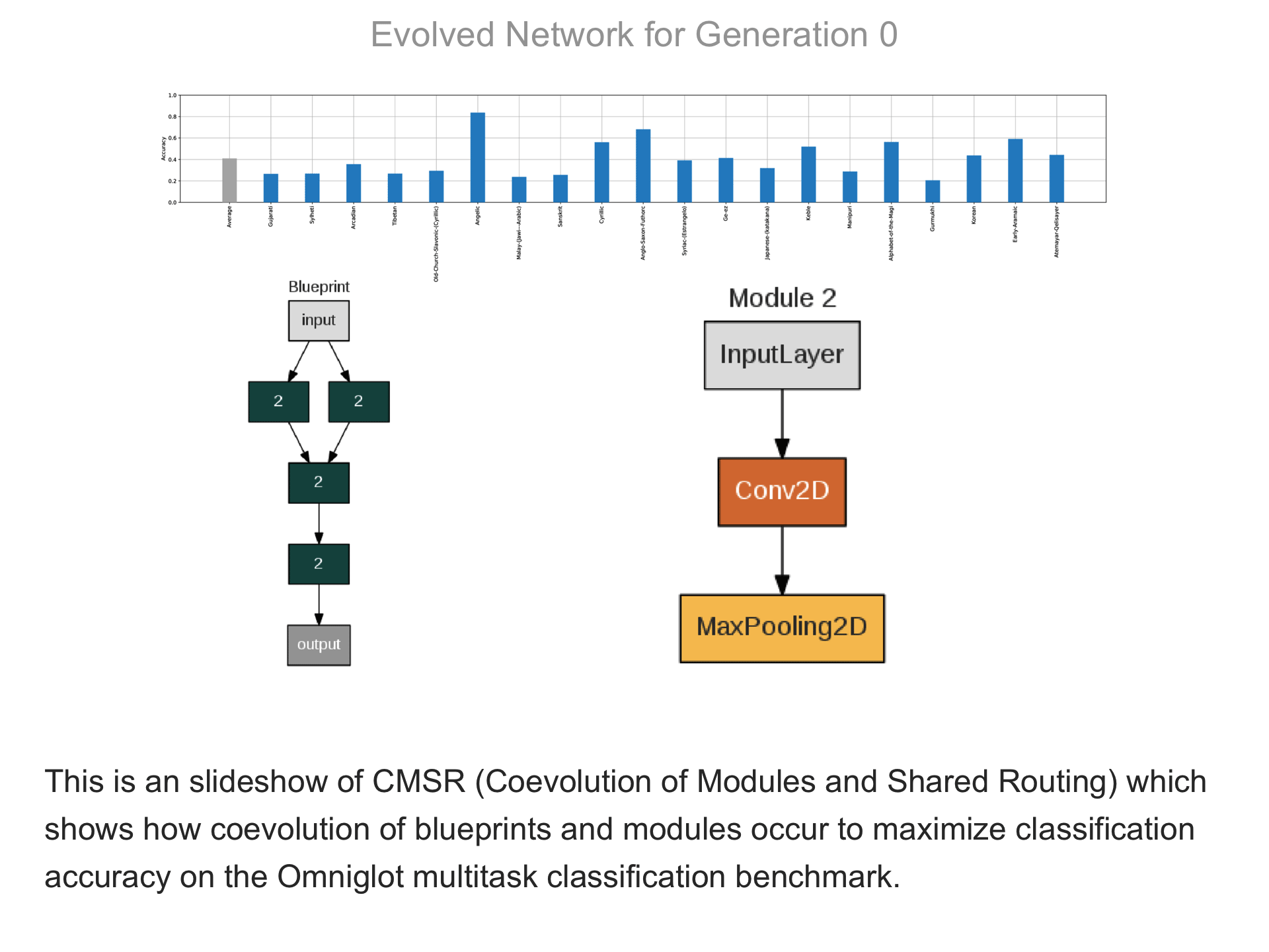 The above demo shows how CMSR constructs complex network architectures for the Omniglot multi-alphabet character recognition task (see Demo 1.3 for a description of this task). Each frame provides a snapshot for the generation identified on top. The bottom part of the frame shows the best blueprint of that generation on the left and the module architectures that the blueprint utilizes on the right. A node whose respective modules have shared weights are indicated by a dark green color. For simplicity, only a single output layer is shown for each blueprint; in reality, there are 20 output layers (one for each alphabet). The top part shows the classification accuracy of the assembled network across 20 different alphabets. The average fitness across all alphabets is shown in the first bar in grey. Note that due to the stochastic nature of evolution, the fitness does not necessarily improve at every generation. The tasks that improve the most from the previous generation are shown in the purple bars. This display thus indicates which tasks are harder to learn than others: for instance, Tibetian (5th bar from the left) and Gukhmuki (4th bar from the right) have complex shapes which make classification hard. The final networks are very complex: they utilize several different kinds of modules, the modules vary in complexity, they have multiple pathways, and occasional weight sharing. Such structures would be very hard to discover by hand, yet they perform very well across the multiple tasks.