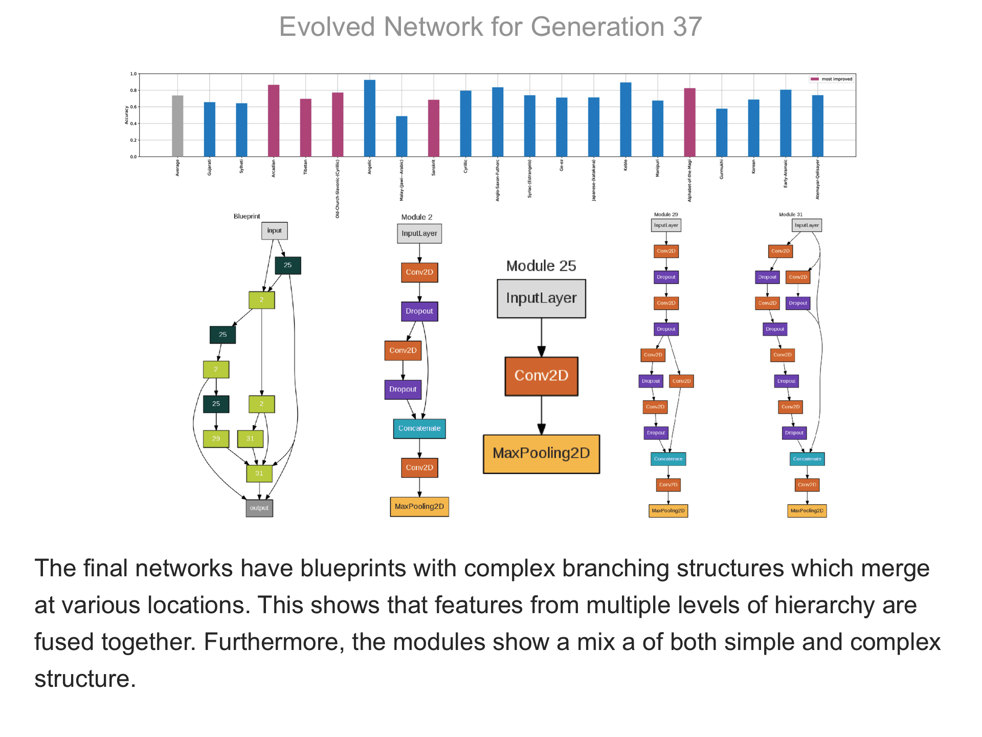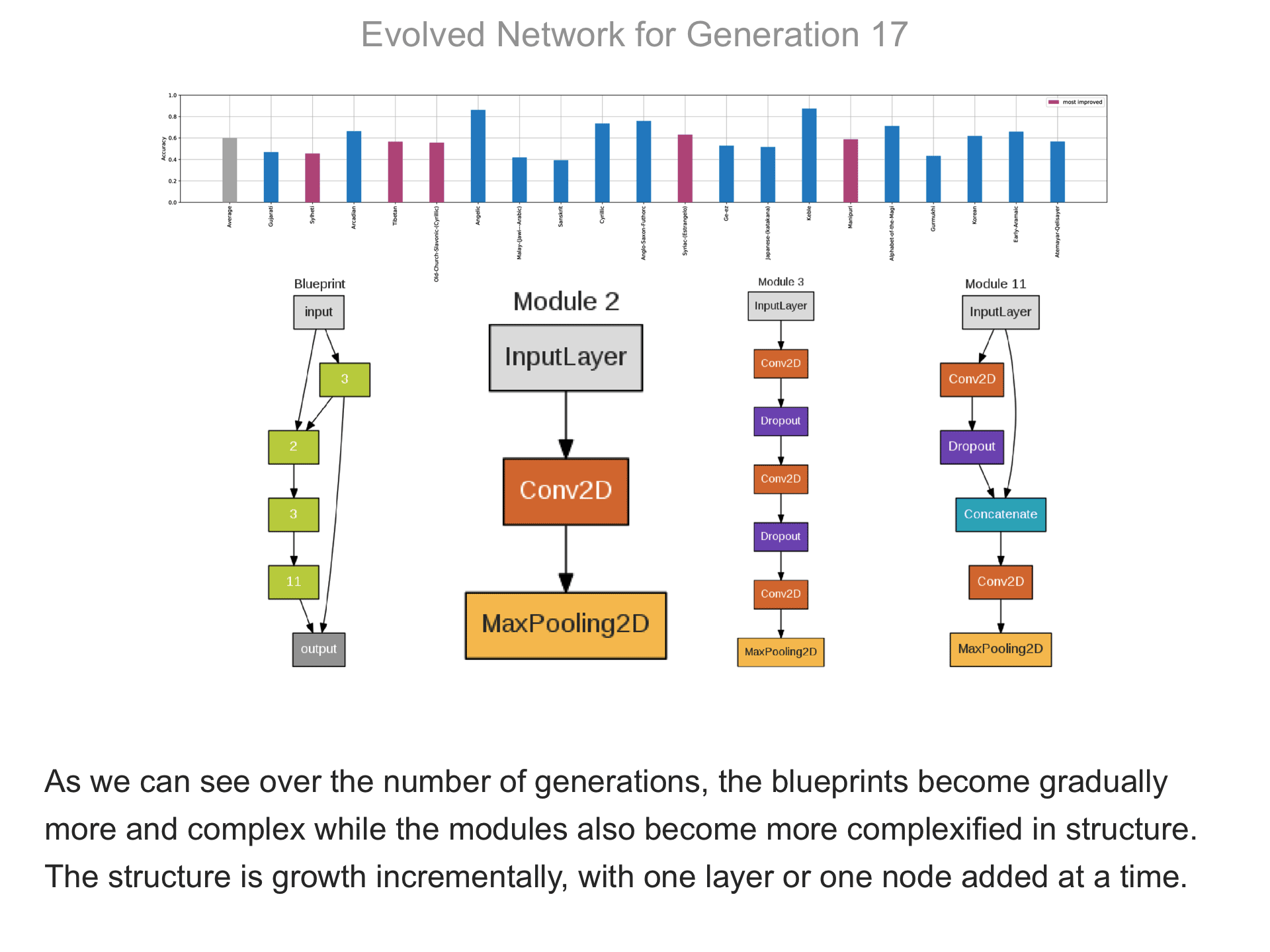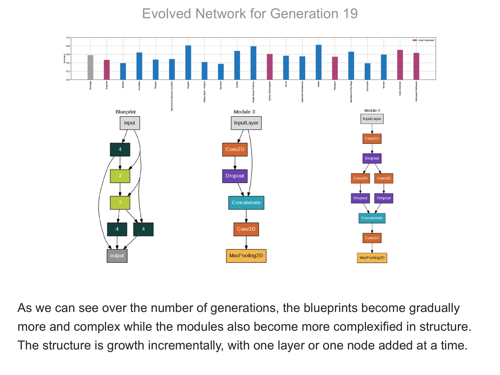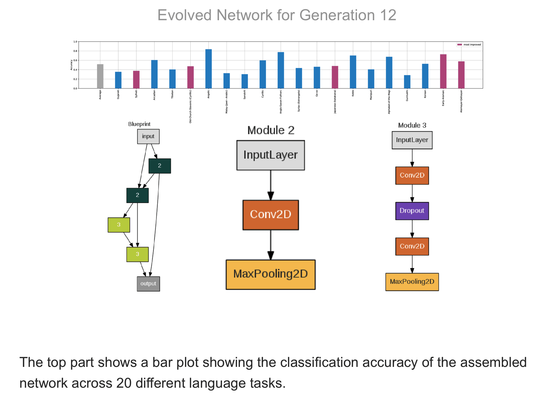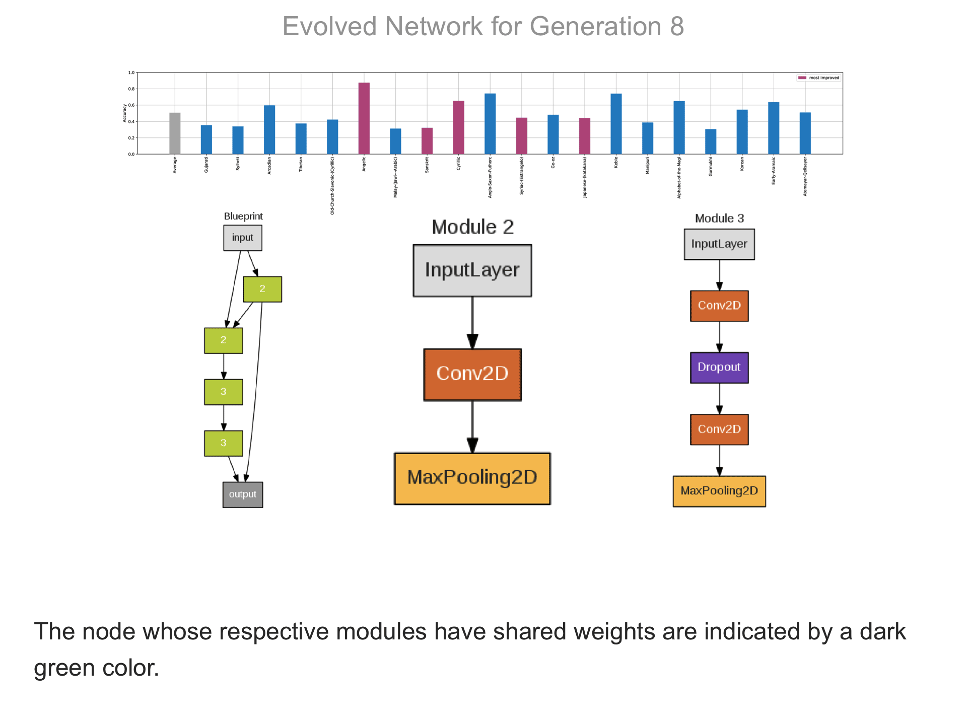 The above demo shows how CMSR constructs complex network architectures for the Omniglot multi-alphabet character recognition task (see Demo 1.3 for a description of this task). Each frame provides a snapshot for the generation identified on top. The bottom part of the frame shows the best blueprint of that generation on the left and the module architectures that the blueprint utilizes on the right. A node whose respective modules have shared weights are indicated by a dark green color. For simplicity, only a single output layer is shown for each blueprint; in reality, there are 20 output layers (one for each alphabet). The top part shows the classification accuracy of the assembled network across 20 different alphabets. The average fitness across all alphabets is shown in the first bar in grey. Note that due to the stochastic nature of evolution, the fitness does not necessarily improve at every generation. The tasks that improve the most from the previous generation are shown in the purple bars. This display thus indicates which tasks are harder to learn than others: for instance, Tibetian (5th bar from the left) and Gukhmuki (4th bar from the right) have complex shapes which make classification hard. The final networks are very complex: they utilize several different kinds of modules, the modules vary in complexity, they have multiple pathways, and occasional weight sharing. Such structures would be very hard to discover by hand, yet they perform very well across the multiple tasks.