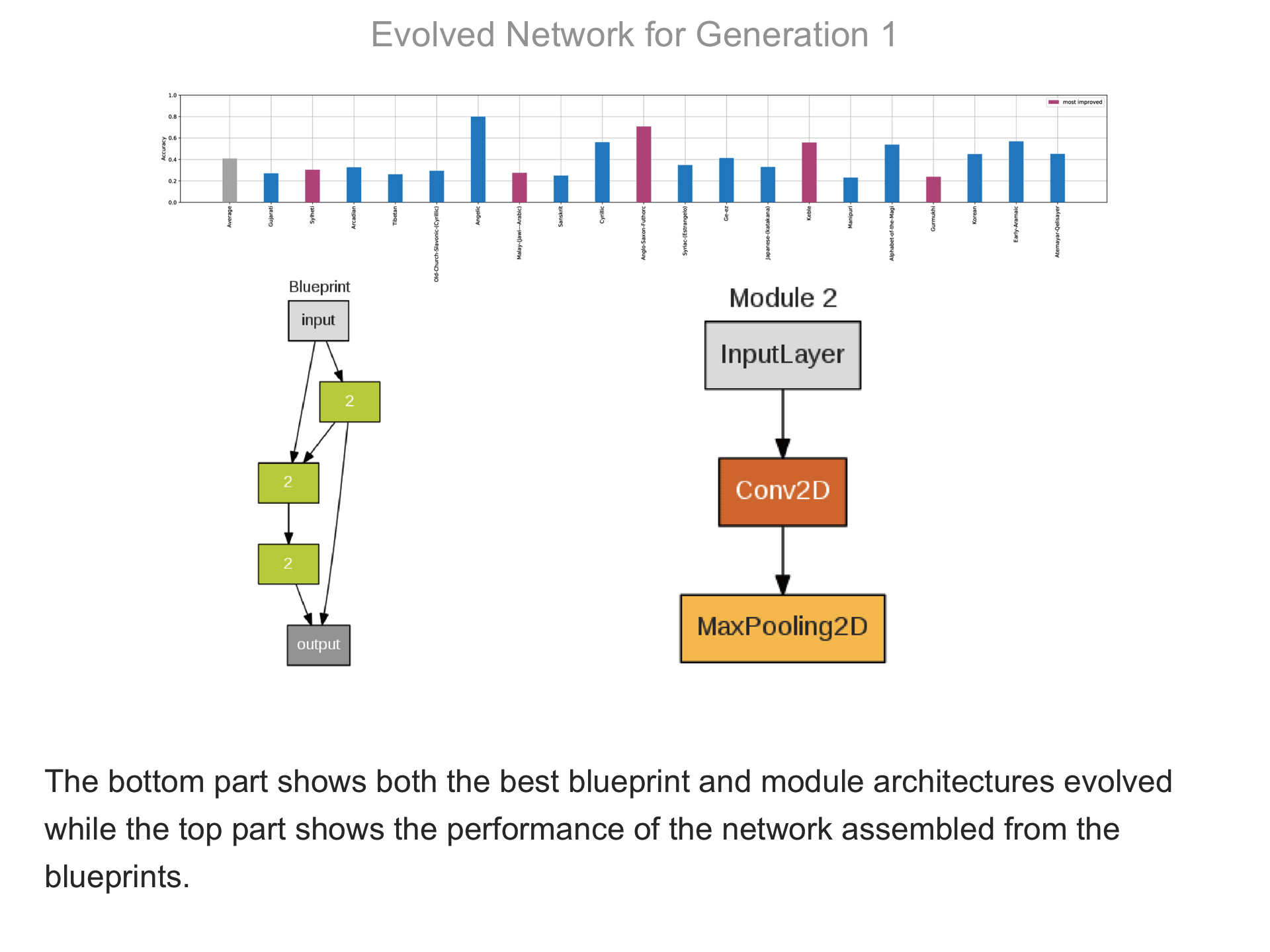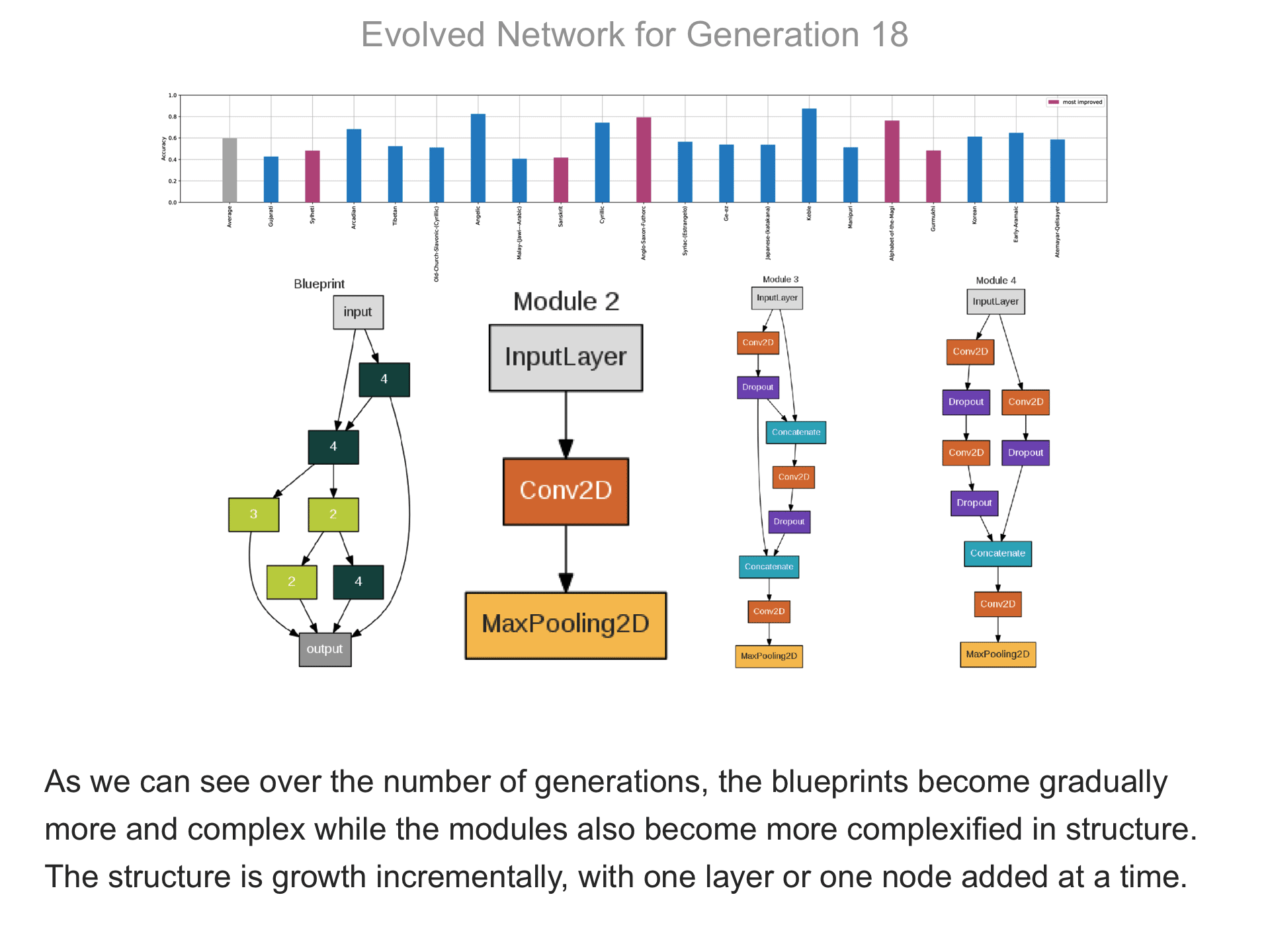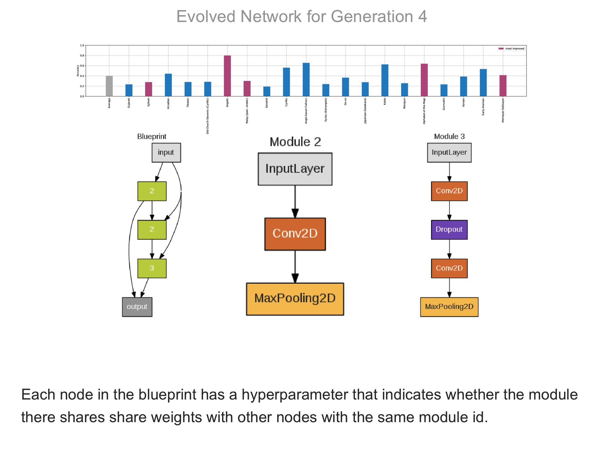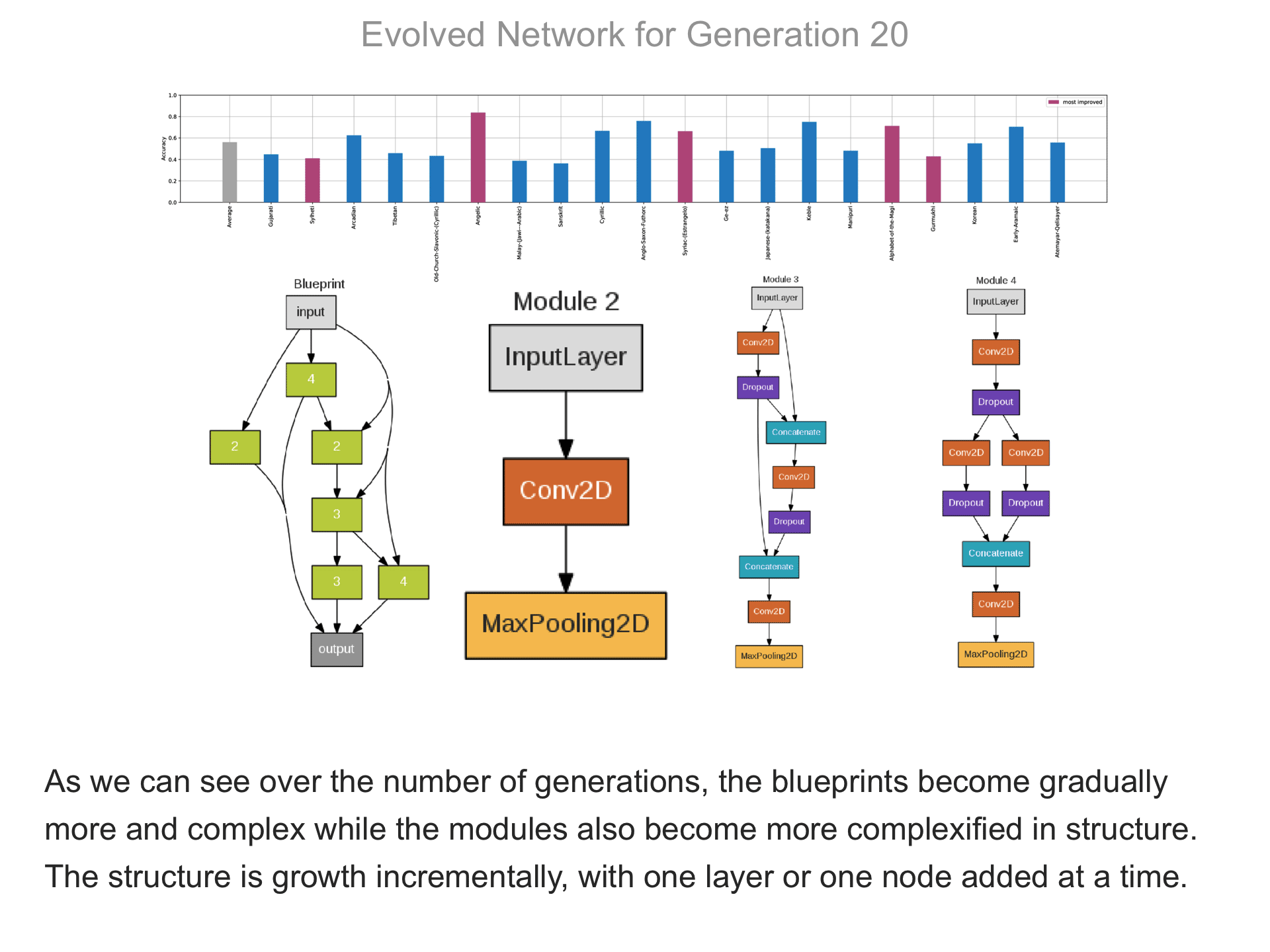 The above demo shows how CMSR constructs complex network architectures for the Omniglot multi-alphabet character recognition task (see Demo 1.3 for a description of this task). Each frame provides a snapshot for the generation identified on top. The bottom part of the frame shows the best blueprint of that generation on the left and the module architectures that the blueprint utilizes on the right. A node whose respective modules have shared weights are indicated by a dark green color. For simplicity, only a single output layer is shown for each blueprint; in reality, there are 20 output layers (one for each alphabet). The top part shows the classification accuracy of the assembled network across 20 different alphabets. The average fitness across all alphabets is shown in the first bar in grey. Note that due to the stochastic nature of evolution, the fitness does not necessarily improve at every generation. The tasks that improve the most from the previous generation are shown in the purple bars. This display thus indicates which tasks are harder to learn than others: for instance, Tibetian (5th bar from the left) and Gukhmuki (4th bar from the right) have complex shapes which make classification hard. The final networks are very complex: they utilize several different kinds of modules, the modules vary in complexity, they have multiple pathways, and occasional weight sharing. Such structures would be very hard to discover by hand, yet they perform very well across the multiple tasks.