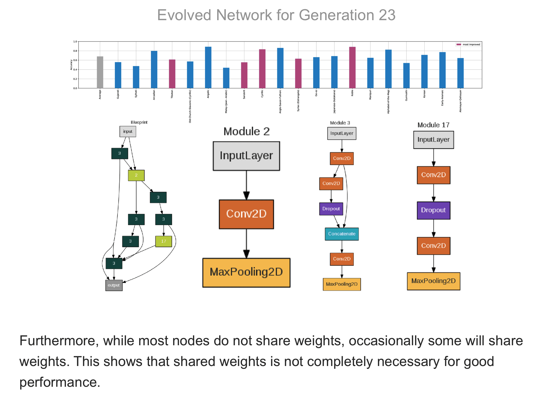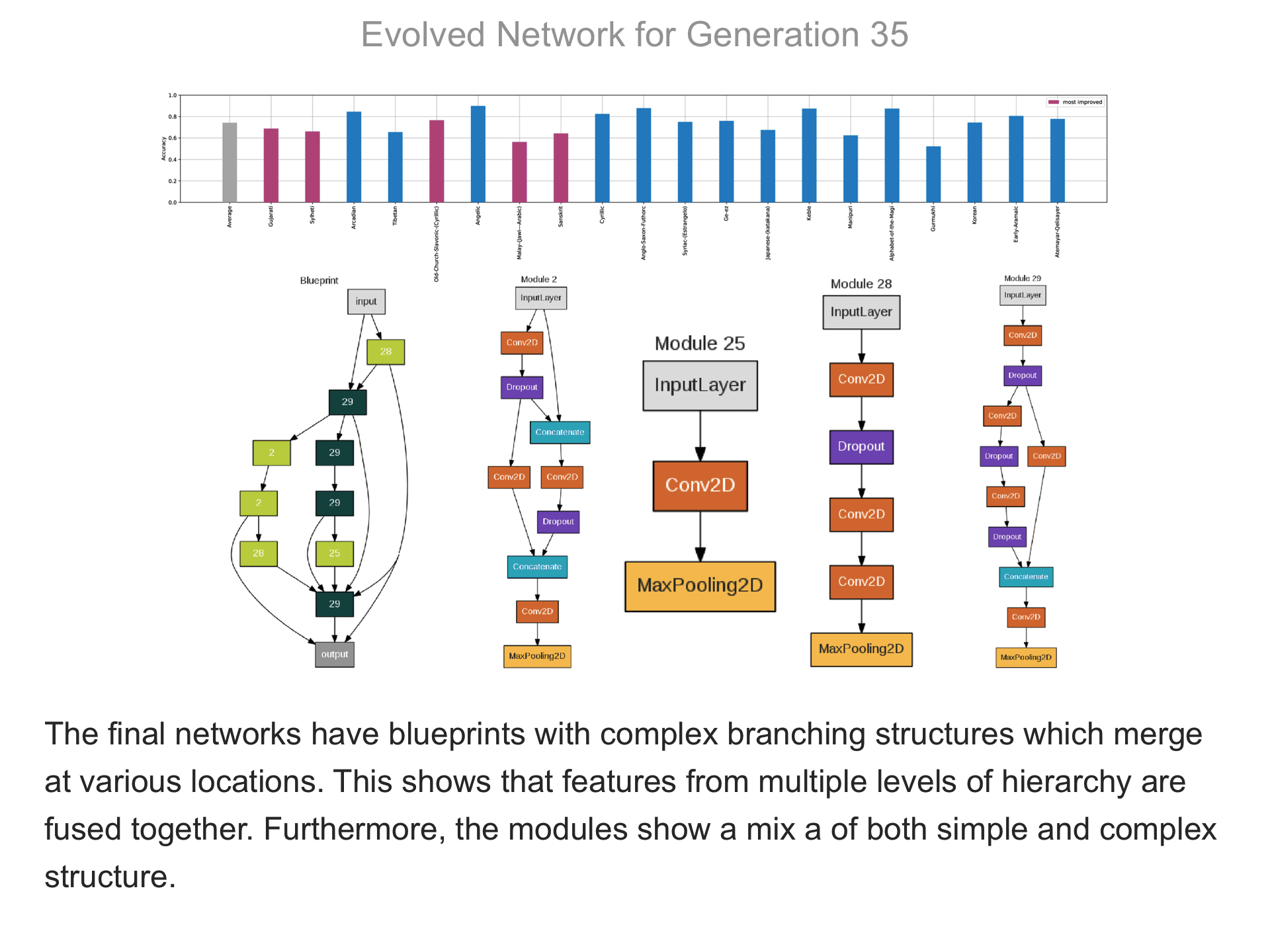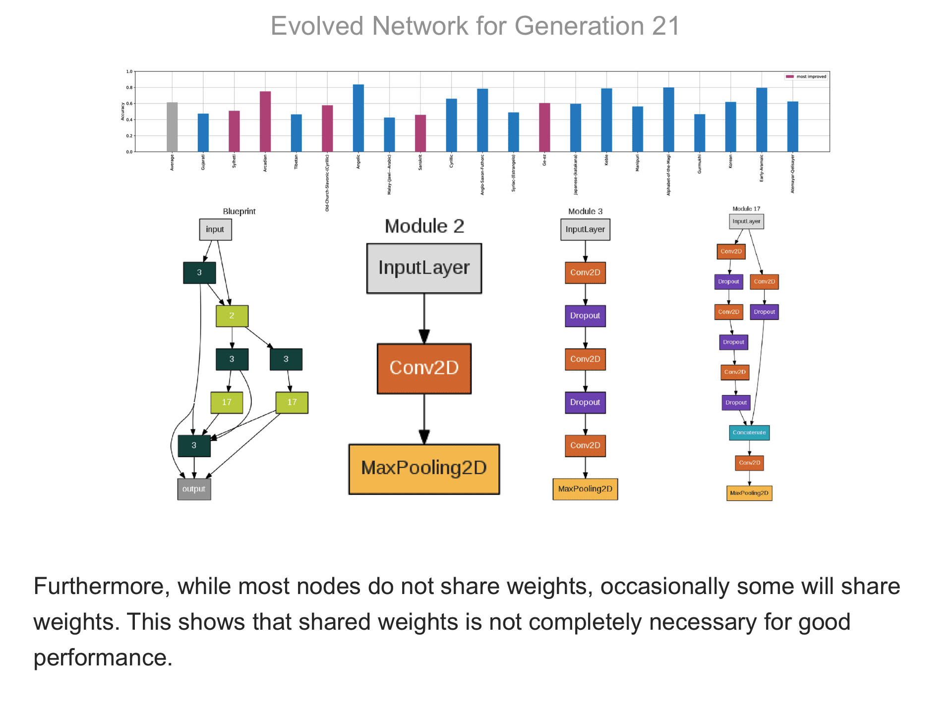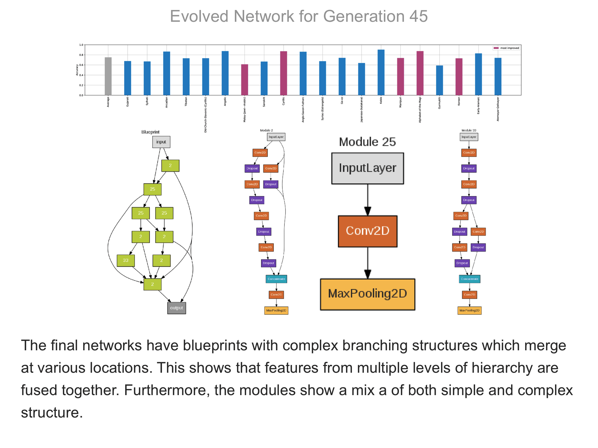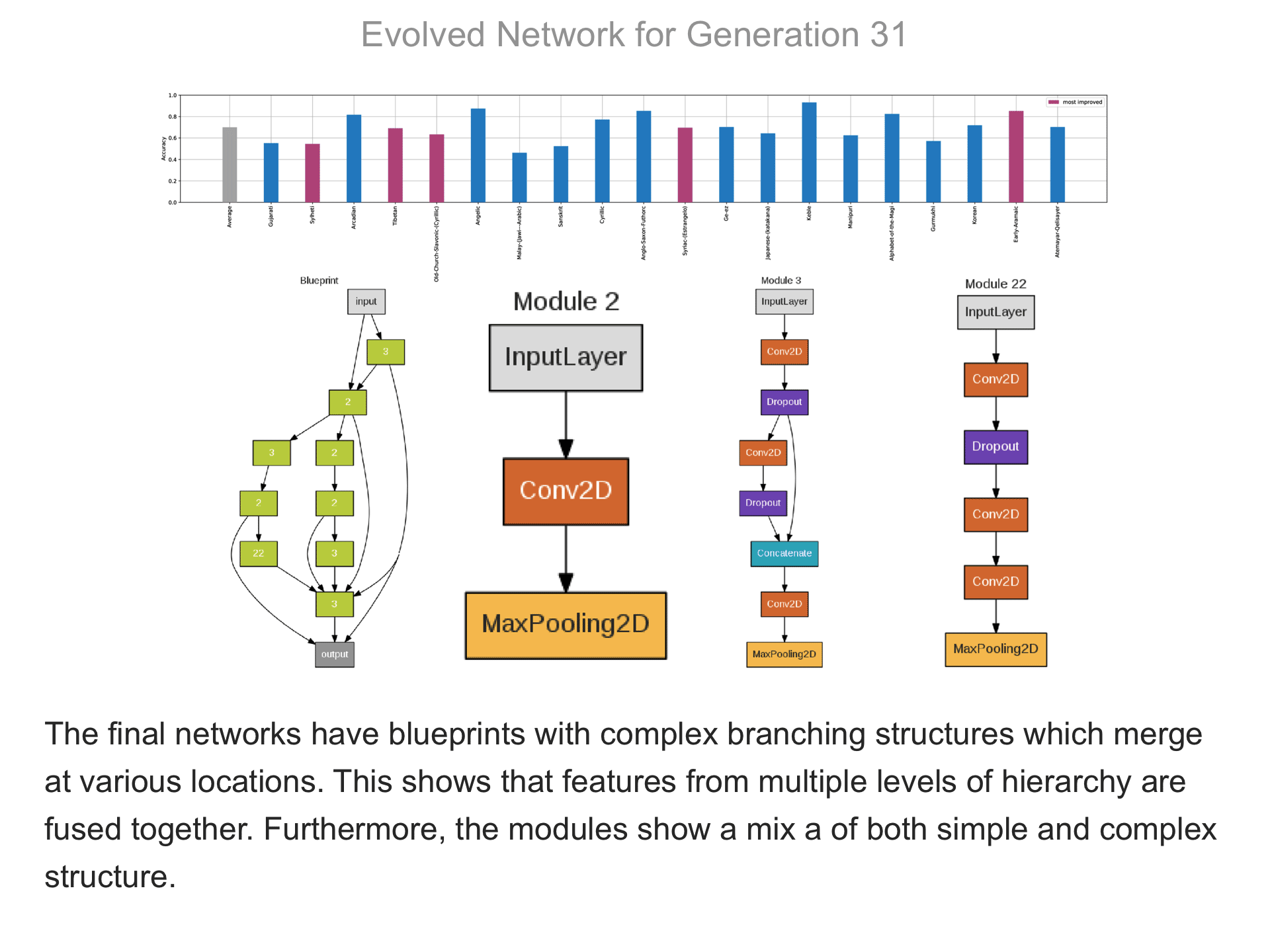 The above demo shows how CMSR constructs complex network architectures for the Omniglot multi-alphabet character recognition task (see Demo 1.3 for a description of this task). Each frame provides a snapshot for the generation identified on top. The bottom part of the frame shows the best blueprint of that generation on the left and the module architectures that the blueprint utilizes on the right. A node whose respective modules have shared weights are indicated by a dark green color. For simplicity, only a single output layer is shown for each blueprint; in reality, there are 20 output layers (one for each alphabet). The top part shows the classification accuracy of the assembled network across 20 different alphabets. The average fitness across all alphabets is shown in the first bar in grey. Note that due to the stochastic nature of evolution, the fitness does not necessarily improve at every generation. The tasks that improve the most from the previous generation are shown in the purple bars. This display thus indicates which tasks are harder to learn than others: for instance, Tibetian (5th bar from the left) and Gukhmuki (4th bar from the right) have complex shapes which make classification hard. The final networks are very complex: they utilize several different kinds of modules, the modules vary in complexity, they have multiple pathways, and occasional weight sharing. Such structures would be very hard to discover by hand, yet they perform very well across the multiple tasks.