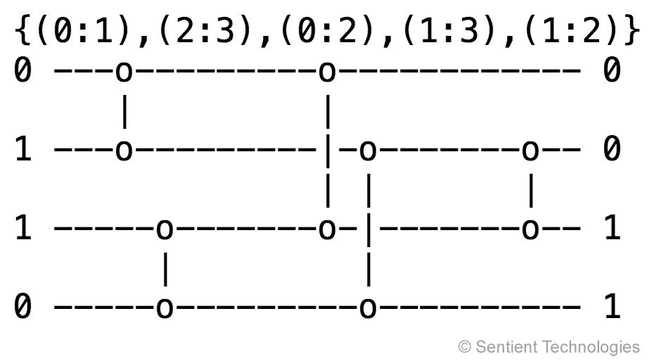 A sorting network is a hardware design where a set of numbers are given on separate input lines and the network gives these numbers in a sorted order in separate output lines. The sorting is performed by several comparators that each compare the numbers in their two input lines and swap them if they are in an incorrect order. The comparators can be grouped into layers where they operate in parallel (layers are separated by a wider gap between comparators above). The goal is to find a network that sorts correctly with as few layers as possible (making the sorting fast) and as few comparators as possible (reducing hardware requirements). As an example, an optimal 4-line sorting network is given above: it consists of five comparators, grouped into three layers. With the given input, the comparators at bottom left and at right swap their inputs and the other three leave them as is. Note that in order to verify that a sorting network is correct, it is only necessary to test it on all binary inputs (Knuth 1998).