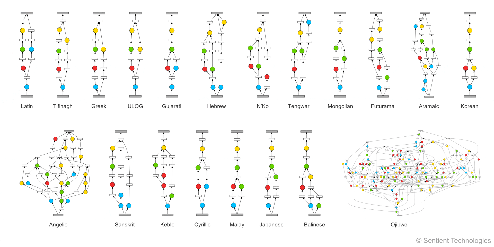 As an example, the image above shows the final routing topologies for a run of CTR in the Omniglot task (see Demo 1.3 for a description of Omniglot). Each topology corresponds to a model for a single task, and uses the same set of modules, identified by the different colors. Importantly, the topologies are reflect the requirements of each task: similar alphabets have similar topologies (such as Latin and Cyrillic, as highlighted above), the topologies discovered are similar across multiple learning runs, and more complex and unique alphabets have more complex topologies (such as Angelic and Ojibwe).