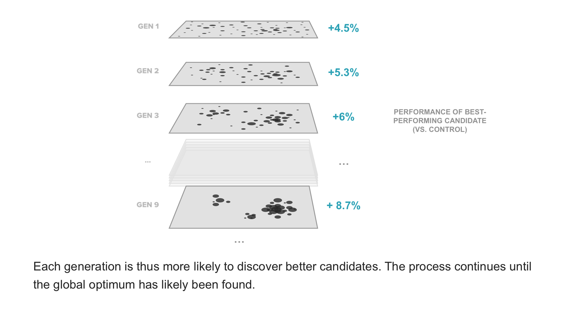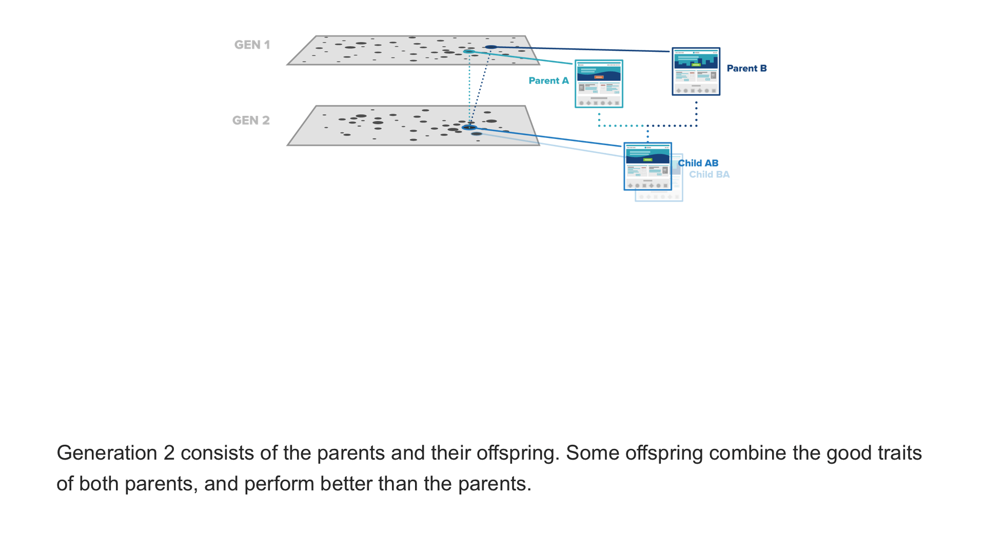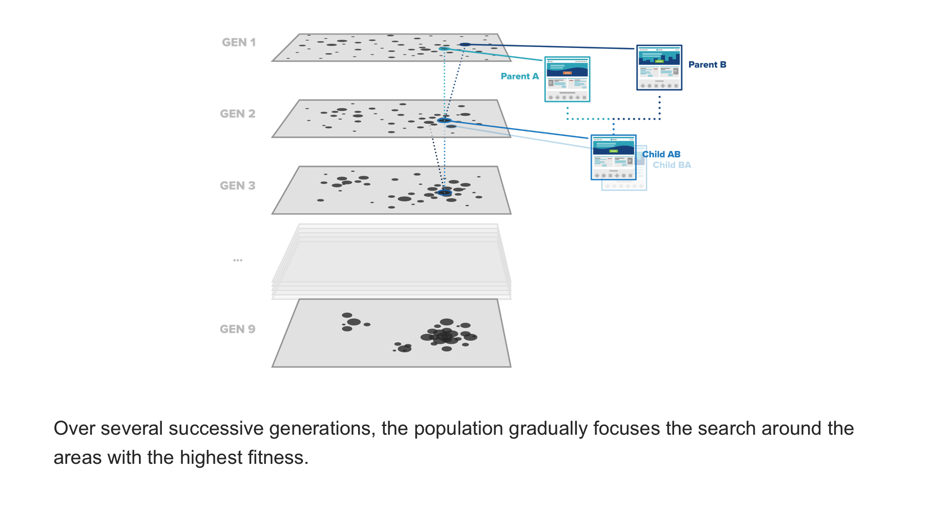 This animation shows how a population of candidates is evolved to discover good solutions. The animation is conceptual and uses the search for effective webpage designs as an example. The search space is visualized as a 2D plane, and the candidates are shown as dots (i.e. locations) on this plane. The larger the dot, the more fit the candidate. Successive generations are shown as successive planes, and parent-offspring relationships by lines between planes. Play the video to see how evolution proceeds to find good solutions!