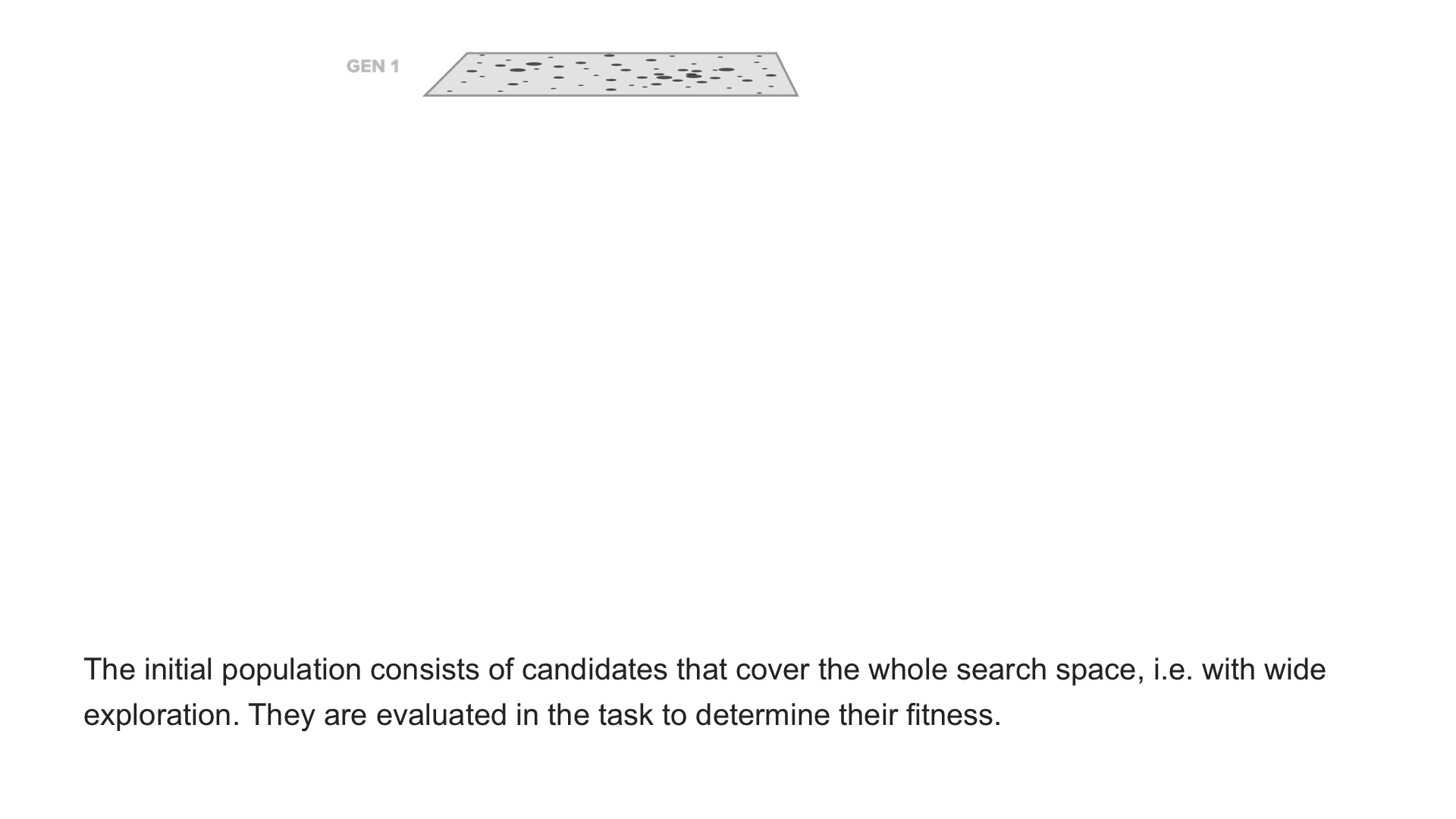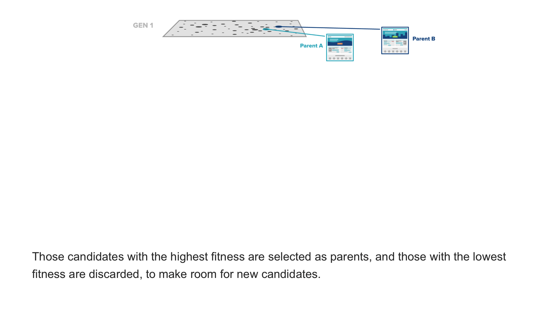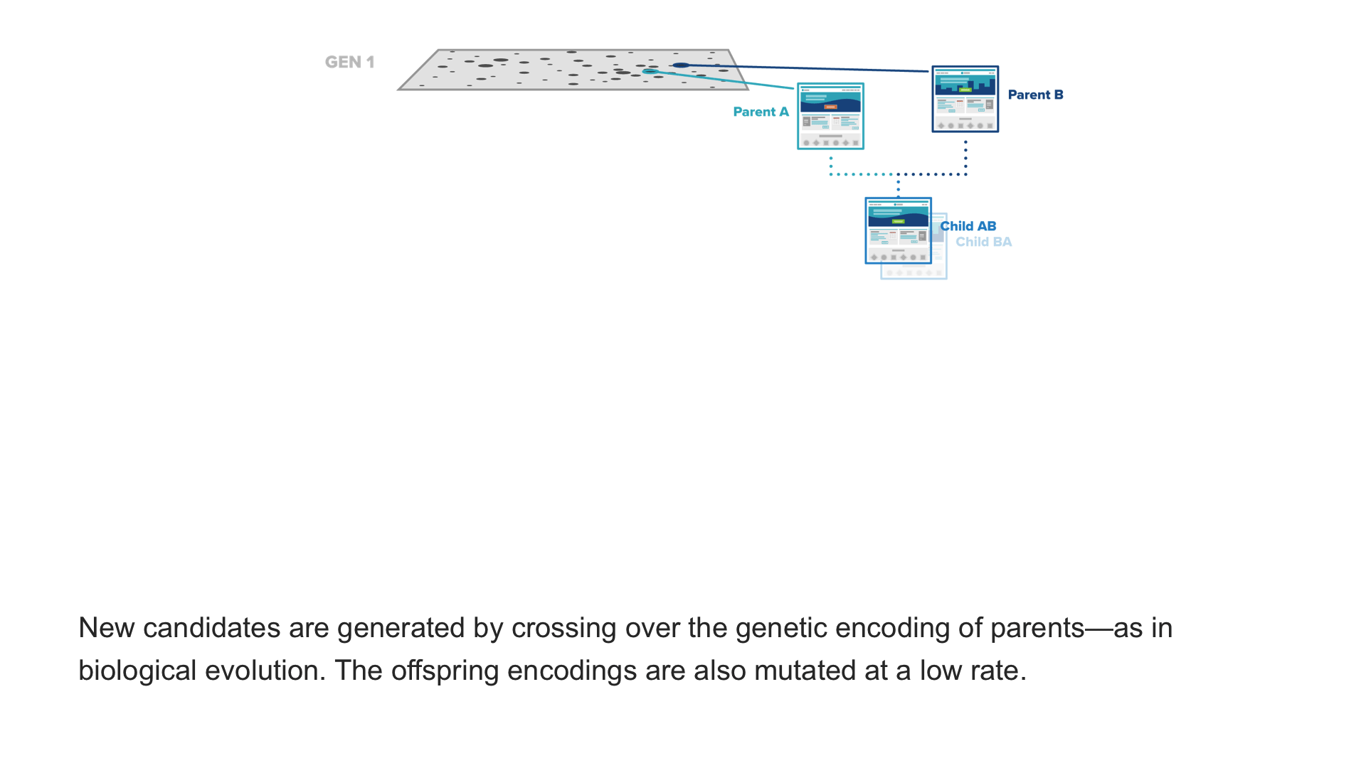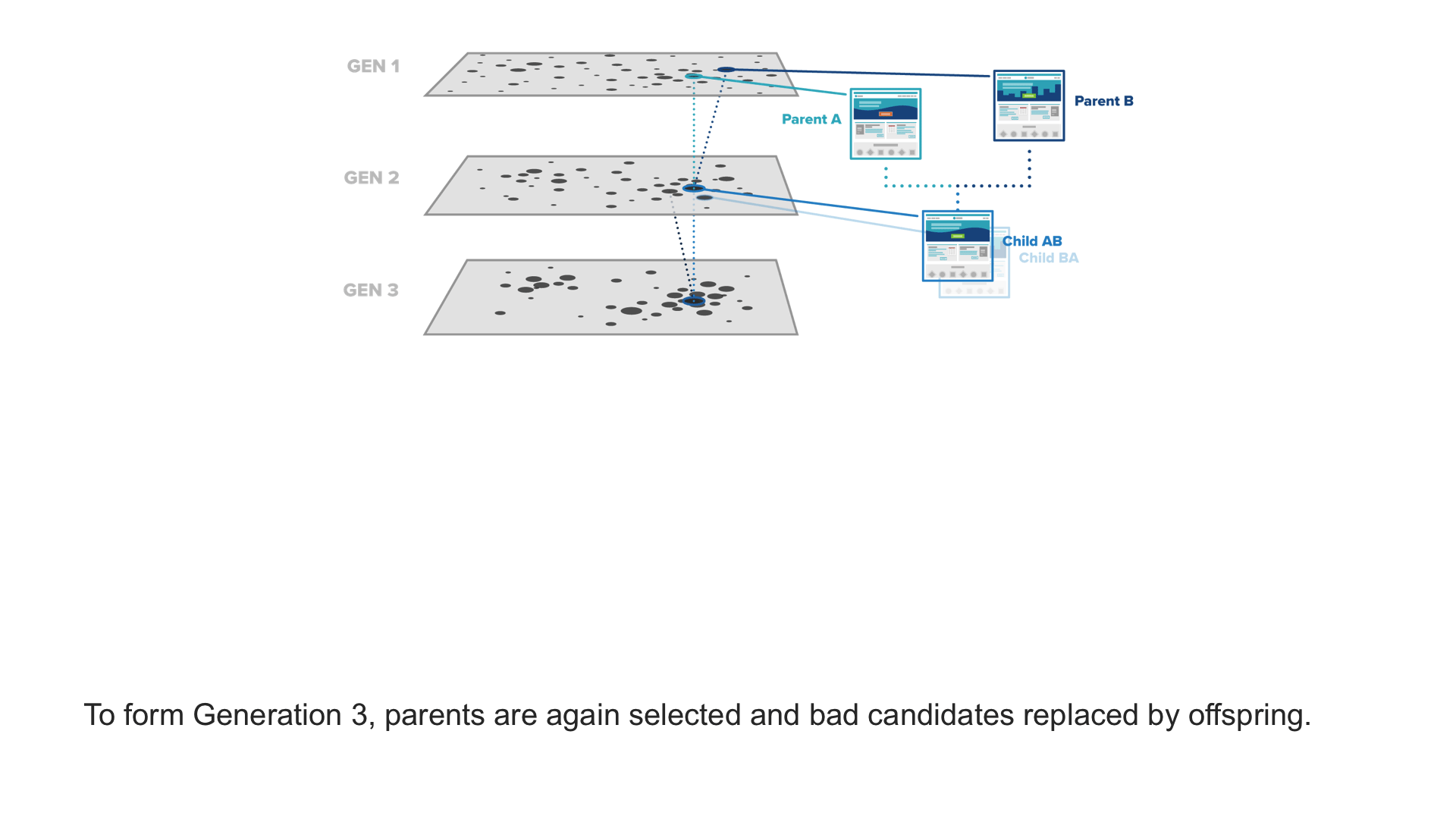 This animation shows how a population of candidates is evolved to discover good solutions. The animation is conceptual and uses the search for effective webpage designs as an example. The search space is visualized as a 2D plane, and the candidates are shown as dots (i.e. locations) on this plane. The larger the dot, the more fit the candidate. Successive generations are shown as successive planes, and parent-offspring relationships by lines between planes. Play the video to see how evolution proceeds to find good solutions!