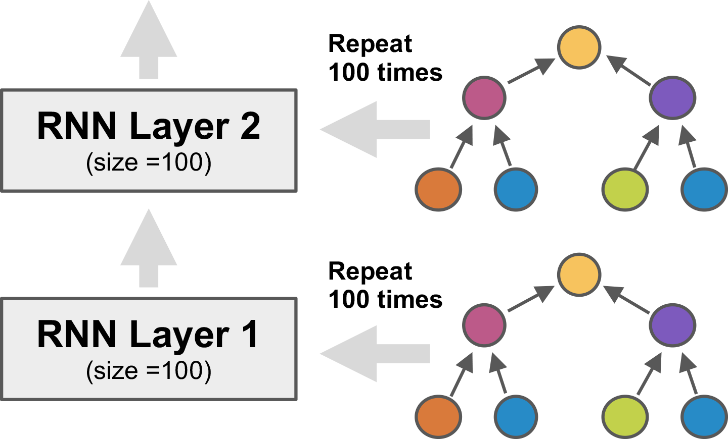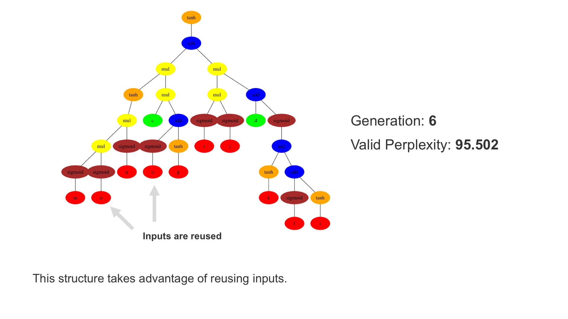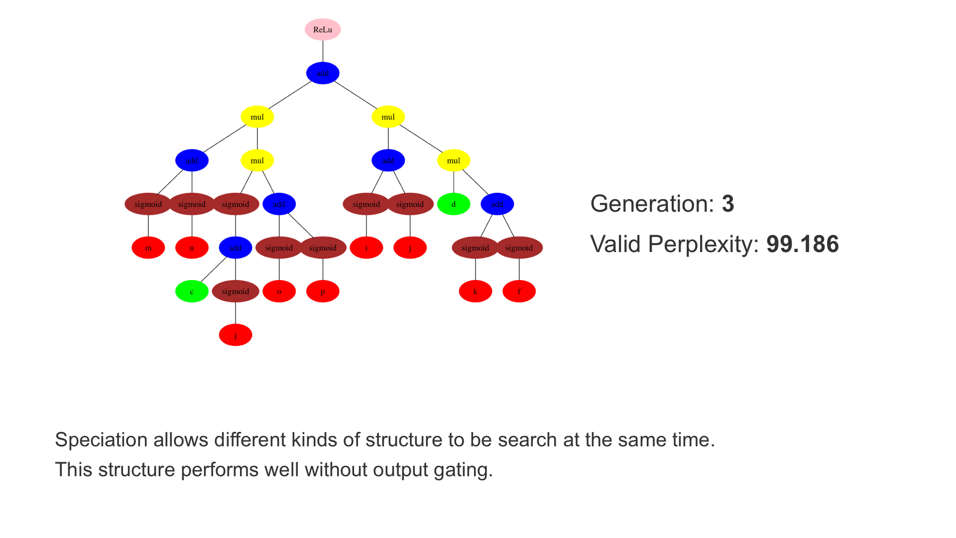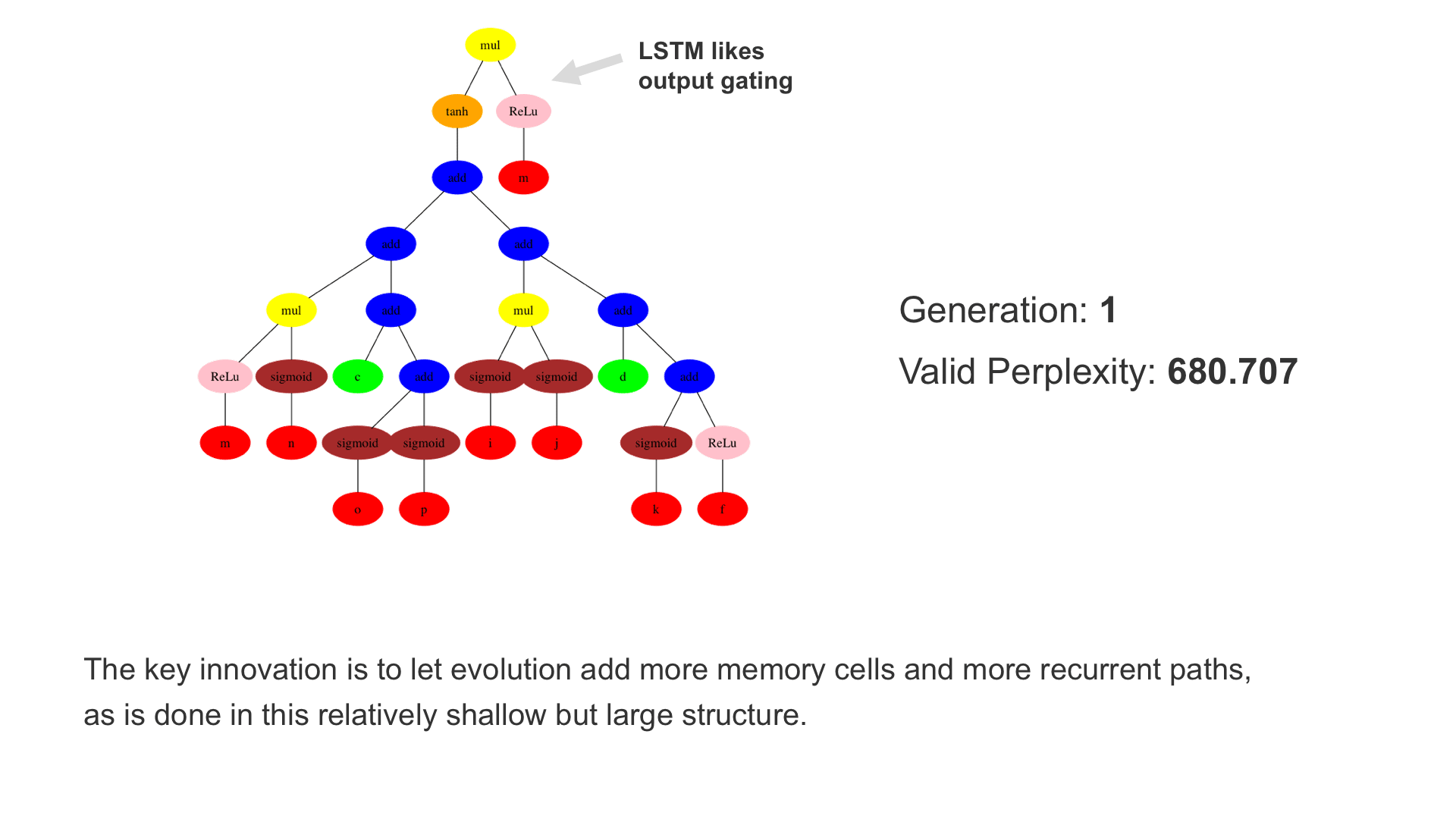 Neuroevolution is a particularly powerful such method, building on the exploratory power of evolutionary search. In particular, Paper 3 demonstrates that when the LSTM node architecture is represented as a tree, genetic programming (GP) methods can be used to evolve it effectively. It is also possible to encourage novelty by using an archive of already explored areas. Third, evaluation times can be reduced by training another LSTM network to predict the final validation performance from partial training. Only the structure of the LSTM node is evolved. The nodes are put together into a layered network, such as the one with two layers with 100 nodes each above that is then trained by gradient descent. In the experiments, such a network improved the state-of-the-art significantly in the standard language modeling benchmark, i.e. predicting the next word in a large text corpus. E.g. with 20M-parameter networks, it exceeded the performance of standard LSTM node by 10.8 perplexity points, and the performance of reinforcement-learning-based neural architecture search by 2.8 points.