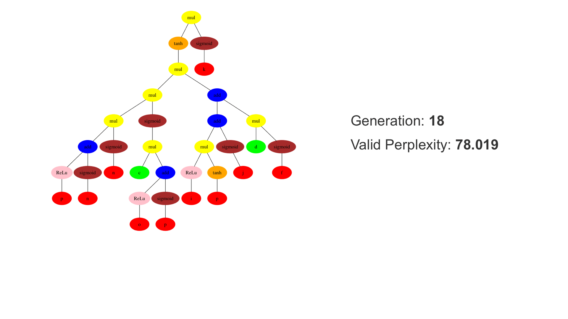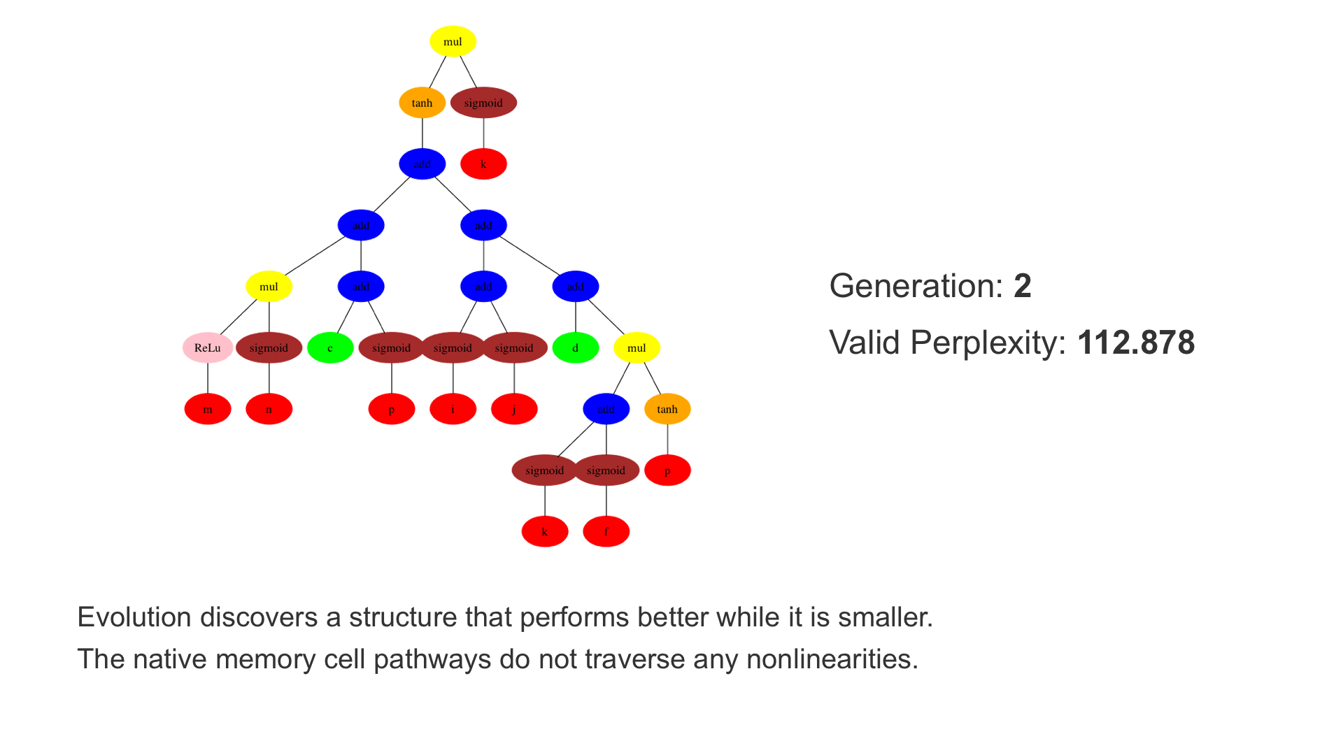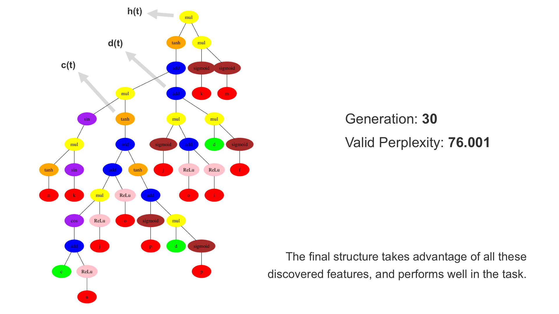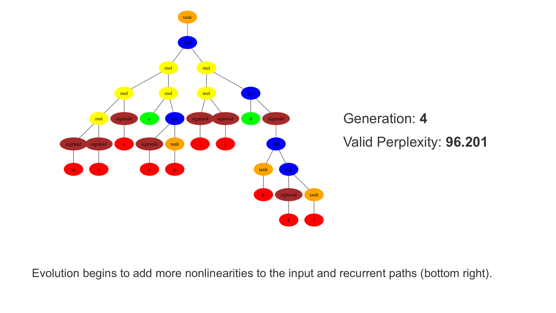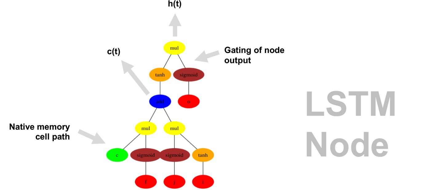 This demo shows how GP discovers an LSTM structure that achieves these results. The evolved tree structures are illustrated as shown above. This image depicts the structure of the standard LSTM as a tree five layers deep. The inputs are indicated by red circles, nonlinear transformations (sigmoid, tanh, ReLu) by brown, orange and pink, sum by blue, and multiplication by yellow. Multiplication establishes gating that controls the input, output, and recurrent paths. The native memory cell is shown by green; its output traverses only linear steps before the next output c(t), and is fed back to the memory cell in the next time step. This design means that its value is preserved and not squashed by nonlinearities. The internal connections have a weight of 1.0 and are not modified by gradient descent. The h(t) is the output of the node. Step through the animation below how evolution gradually complexifies the design and improves the performance!