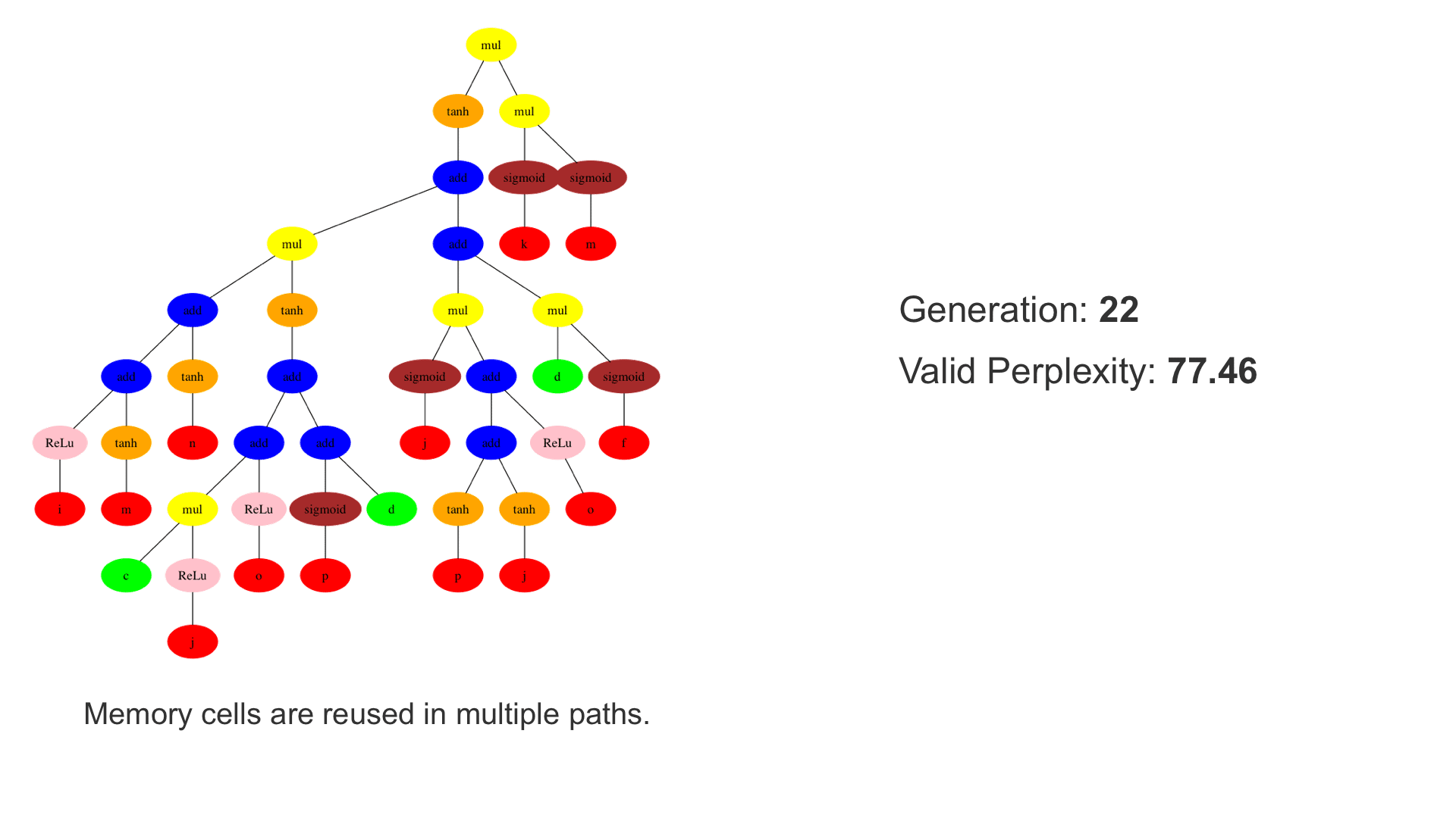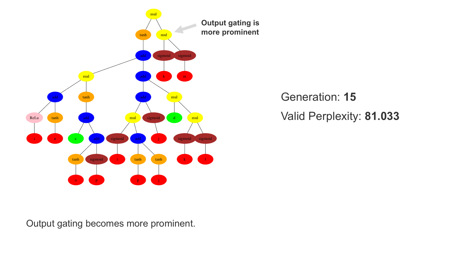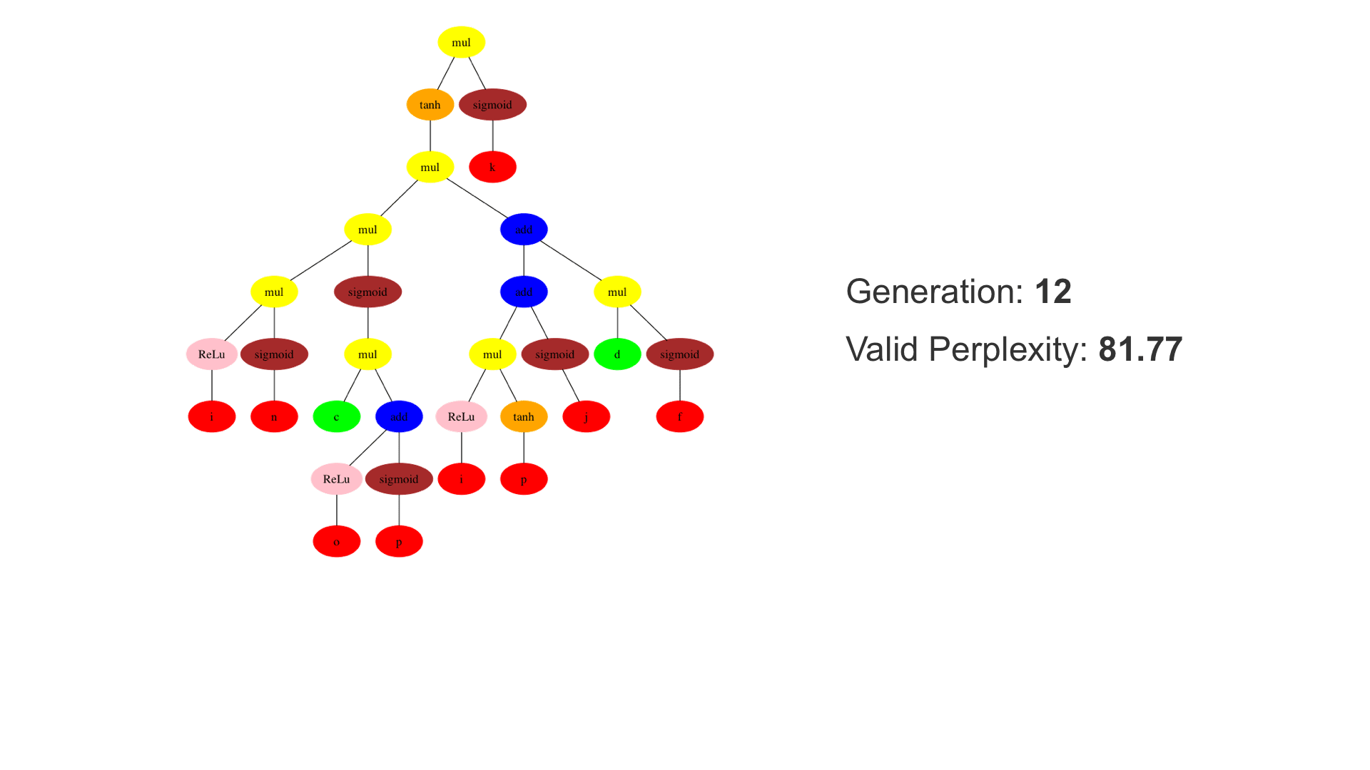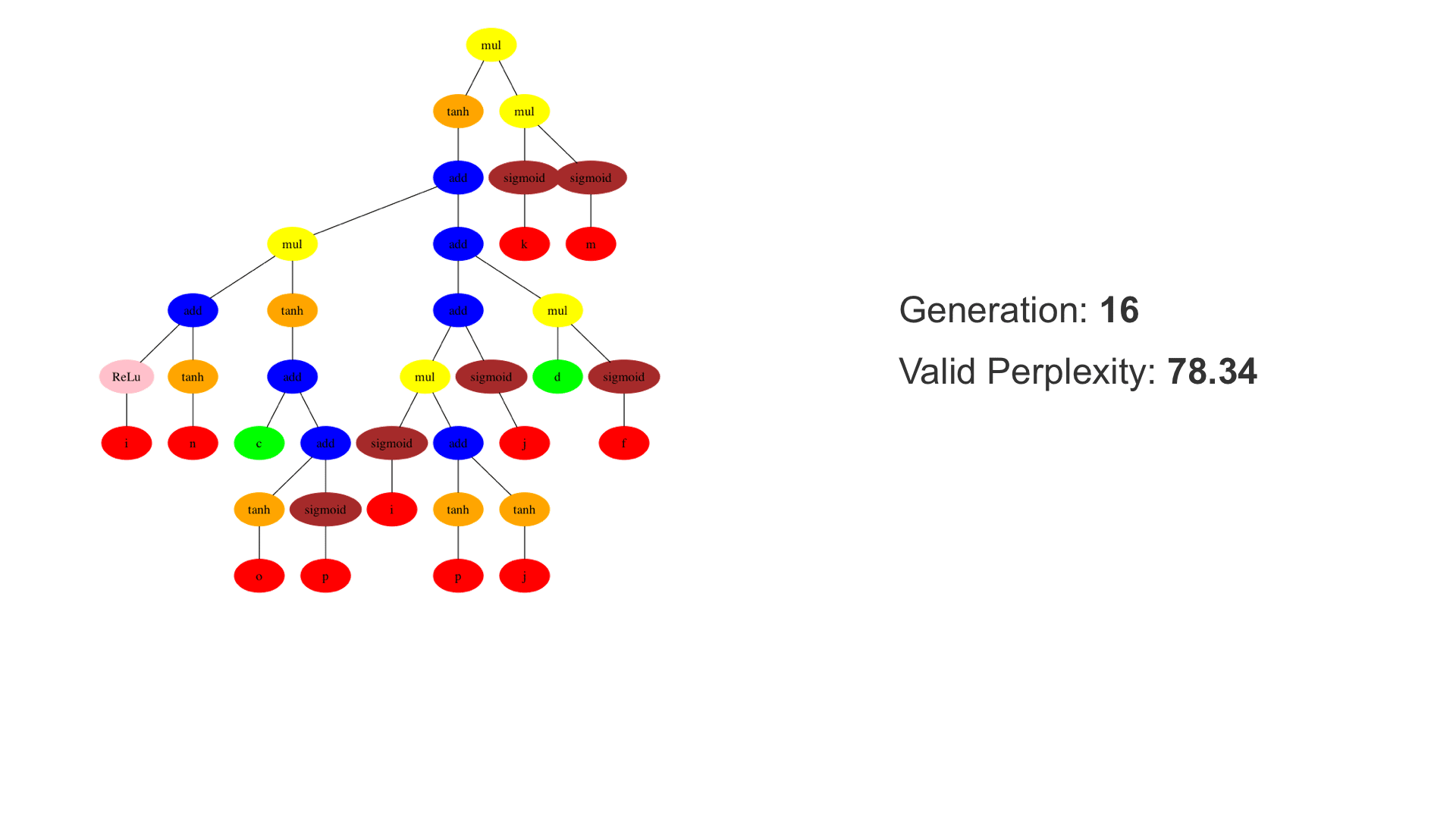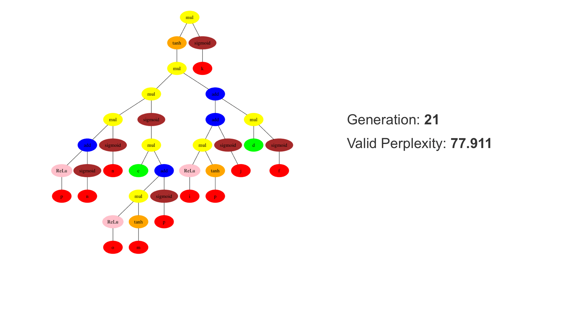 This demo shows how GP discovers an LSTM structure that achieves these results. The evolved tree structures are illustrated as shown above. This image depicts the structure of the standard LSTM as a tree five layers deep. The inputs are indicated by red circles, nonlinear transformations (sigmoid, tanh, ReLu) by brown, orange and pink, sum by blue, and multiplication by yellow. Multiplication establishes gating that controls the input, output, and recurrent paths. The native memory cell is shown by green; its output traverses only linear steps before the next output c(t), and is fed back to the memory cell in the next time step. This design means that its value is preserved and not squashed by nonlinearities. The internal connections have a weight of 1.0 and are not modified by gradient descent. The h(t) is the output of the node. Step through the animation below how evolution gradually complexifies the design and improves the performance!