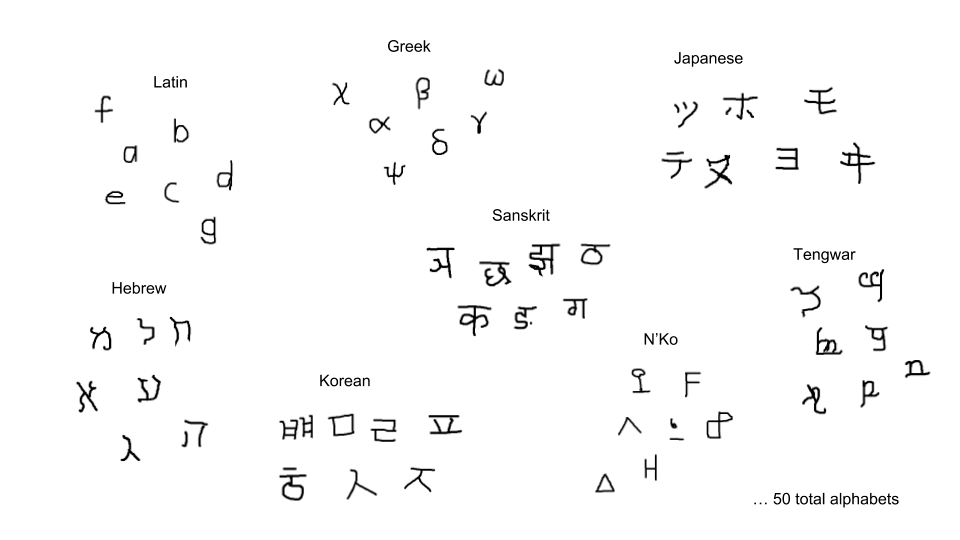 The Omniglot task contains 50 alphabets (most natural, some artificial), 20 of which were used in this demo. As you can see from the sample below, the alphabets have different perceptual characteristics, which makes the tasks of recognizing one set different but related to the others. Therefore, learning them all simultaneously helps learning in each one—which is the main promise of multitask learning. This effect is especially important when there is only a very small amount of training data available for each task, which is indeed the case in Omniglot. In many real world applications, labeled data is expensive or dangerous to acquire (e.g., medical applications, agriculture, and robotic rescue), hence automatically designing models that exploit the relationships to similar or related datasets could, in a way, substitute the missing dataset and boost research capabilities. It is also an excellent demonstration of the power of neuroevolution: There are many ways in which the languages can be related, and evolution discovers the best ways to tie their learning together.