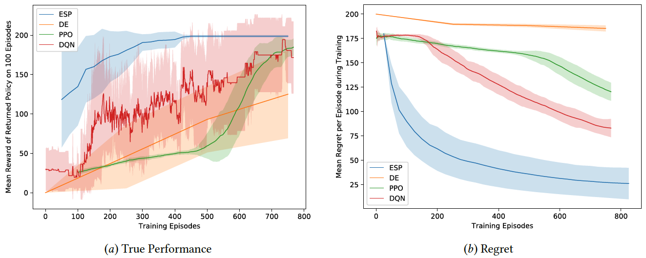 The results are similar in all three domains: Compared to direct evolution and standard reinforcement learning methods PPO and DQN, ESP learns better solutions, learns faster, has lower variance, and lower regret. In other words, it is more sample-efficient, reliable, and safe. The figure below quantifies these conclusions for the cartpole domain. See Demo 1.1 for a visualization in function approximation, and Demo 1.2 for illustration of behavior in the flappy bird domain.