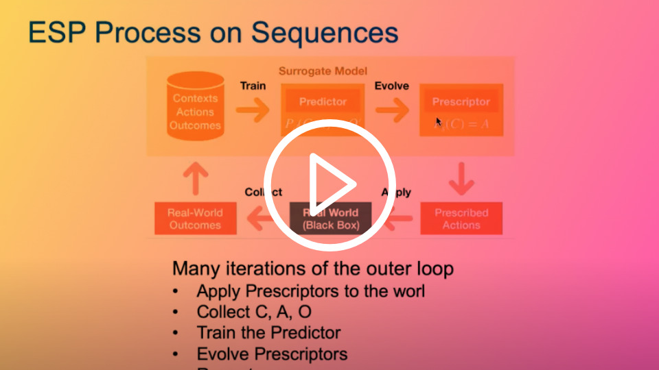 ESP can be applied to sequential decision tasks by extending the contexts and actions to sequences. The Prescriptor can be seen as an RL agent, taking the current context as input, and deciding what actions to perform in each time step. The output of the Predictor, can be seen as the reward vector for that step, i.e. as Q values. Evolution thus aims to maximize the predicted reward, or minimize the regret, throughout the sequence.