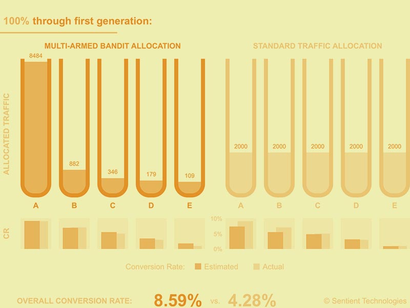 First, Paper 1, on Sentient Ascend gives an overview of one such product: conversion rate optimization of web interfaces through evolutionary design. Ascend is disruptive technology based on EC. While the state of the art is based on statistical testing of a small number of human designs (A/B testing), Ascend makes it possible to search a vast space of possible designs to find better ones automatically: “It is AI, not A/B”. Demo 1.1 presents a case study of Ascend on a real website, showing how it discovers designs that are both better than human design, and surprising, i.e. something humans would be unlikely to discover.
